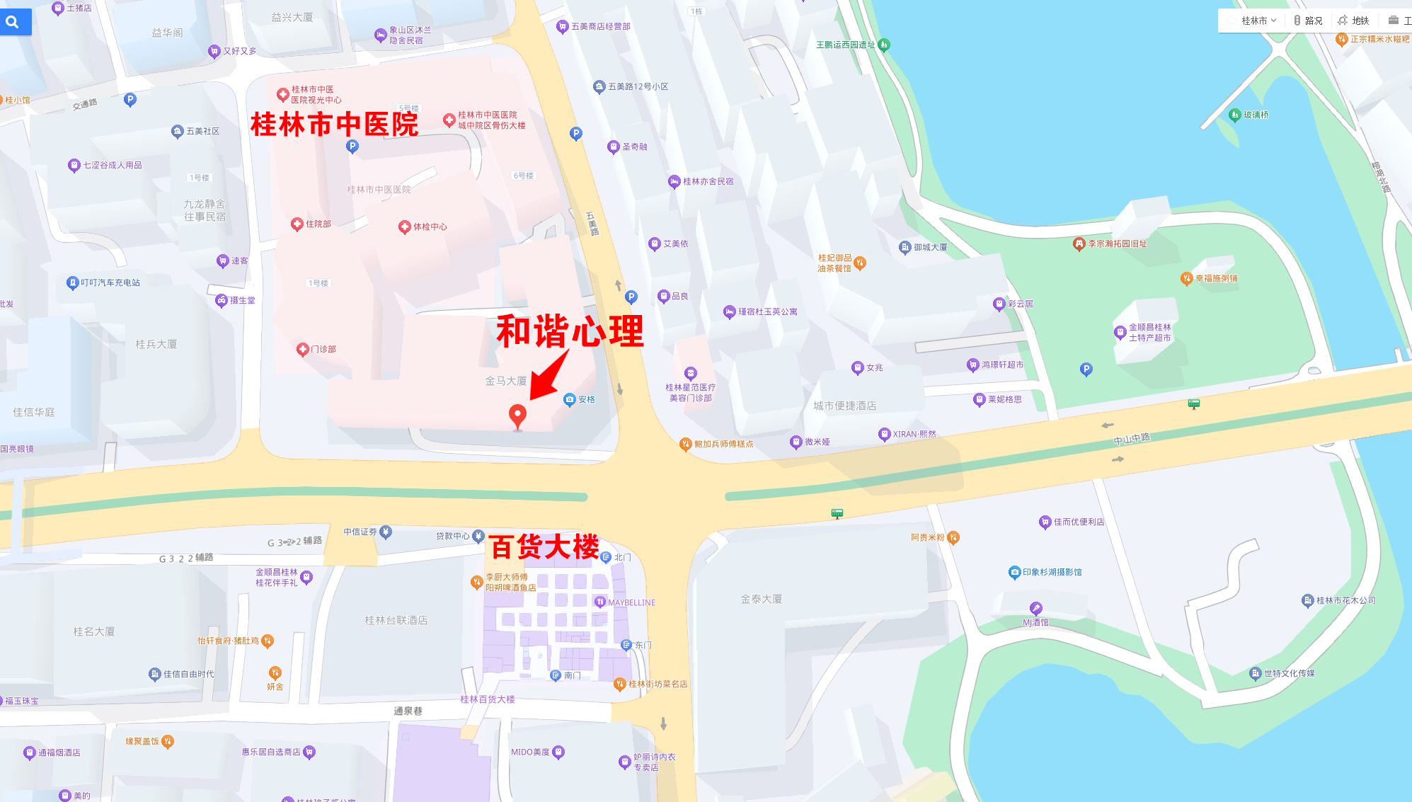 广西和谐心理坐落于桂林百货大楼对面金马大厦3单元6楼(桂林市中医医院旁边)